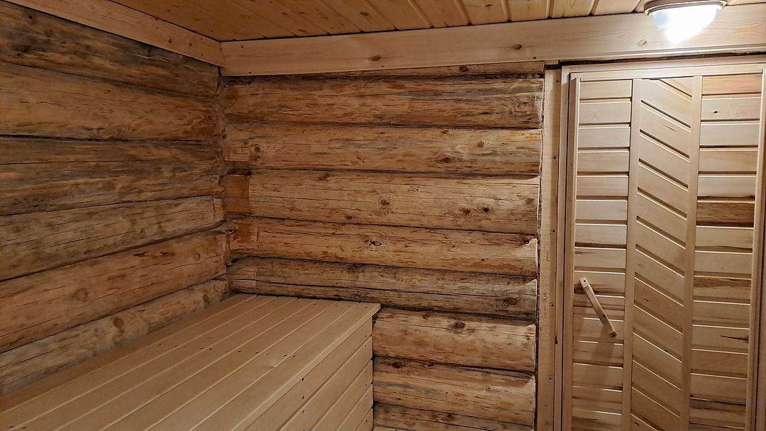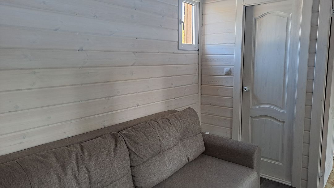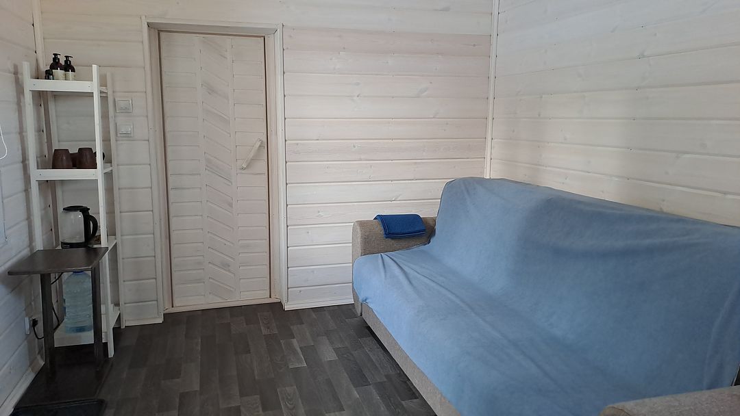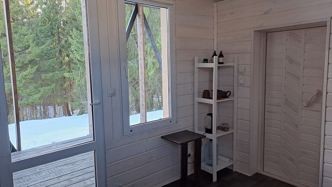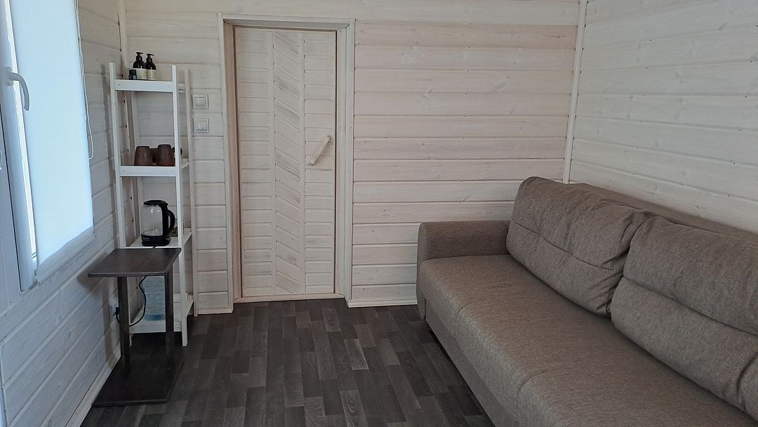 В предбаннике — удобный диван с чистым непромокаемым наматрасником из хлопка, столик, электрический чайник, чайный набор, вода и чай. Есть туалет и раковина. Из панорамного окна открывается вид на сосновый лес — окно непроницаемо снаружи, при необходимости можно воспользоваться жалюзи.