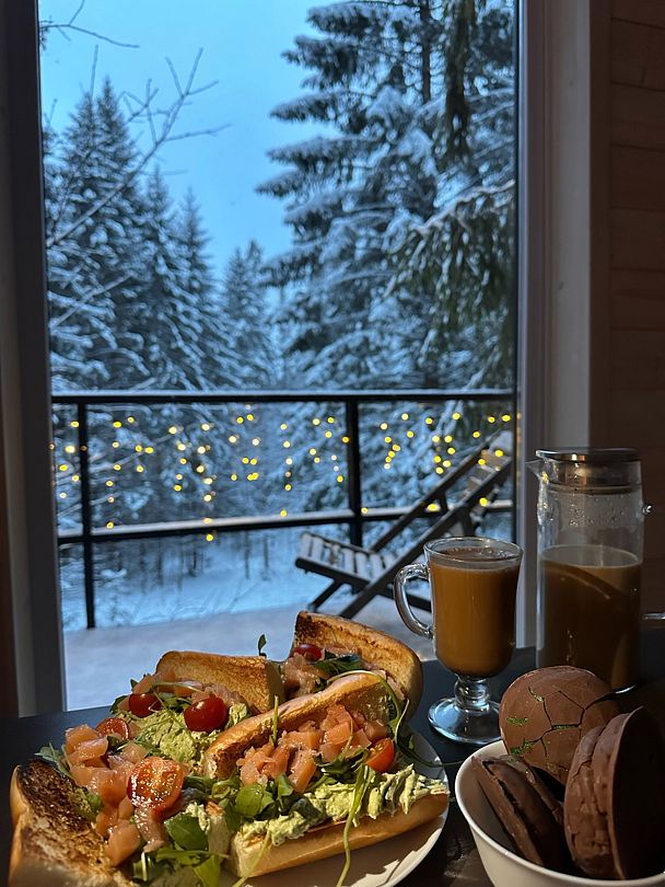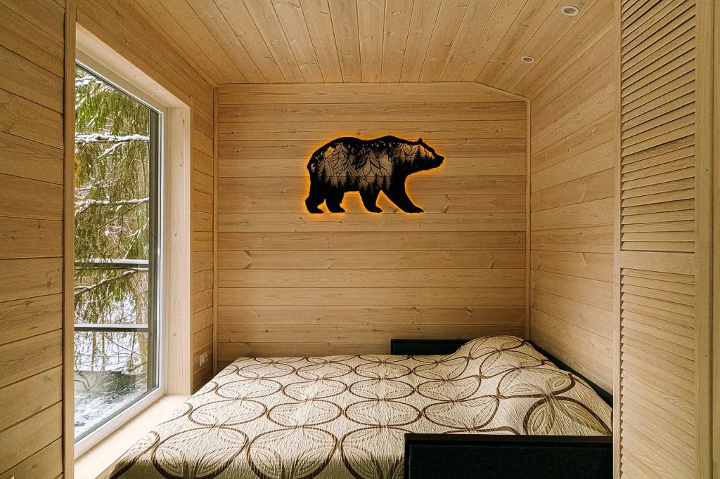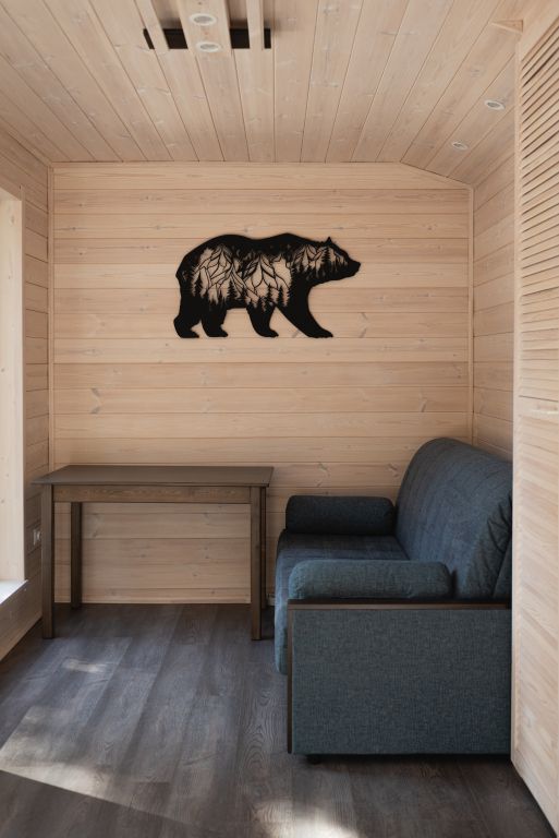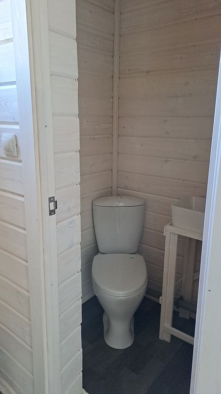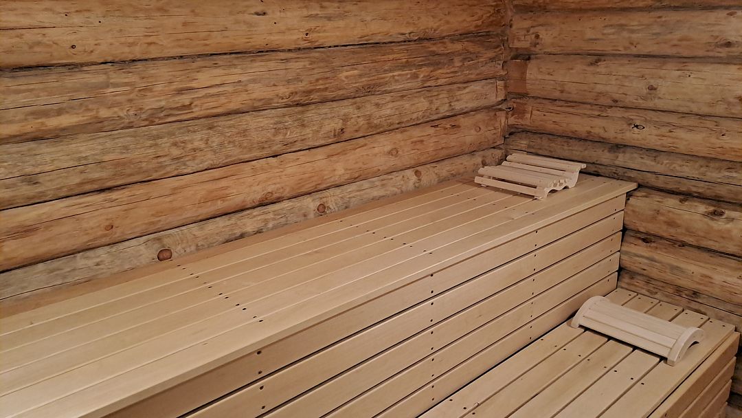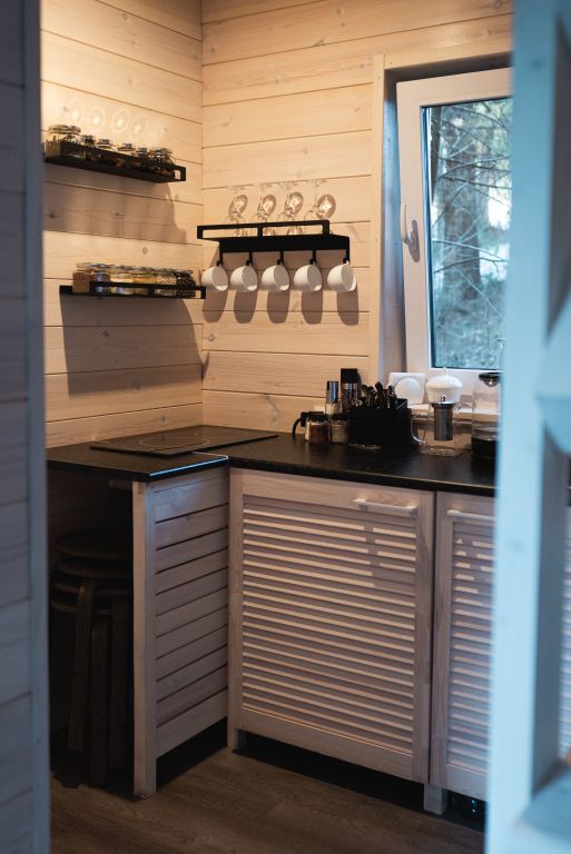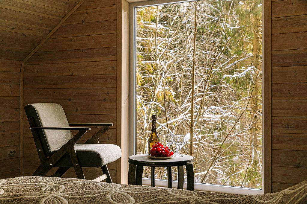 В предбаннике — удобный диван с чистым непромокаемым наматрасником из хлопка, столик, электрический чайник, чайный набор, вода и чай. Есть туалет и раковина. Из панорамного окна открывается вид на сосновый лес — окно непроницаемо снаружи, при необходимости можно воспользоваться жалюзи.
