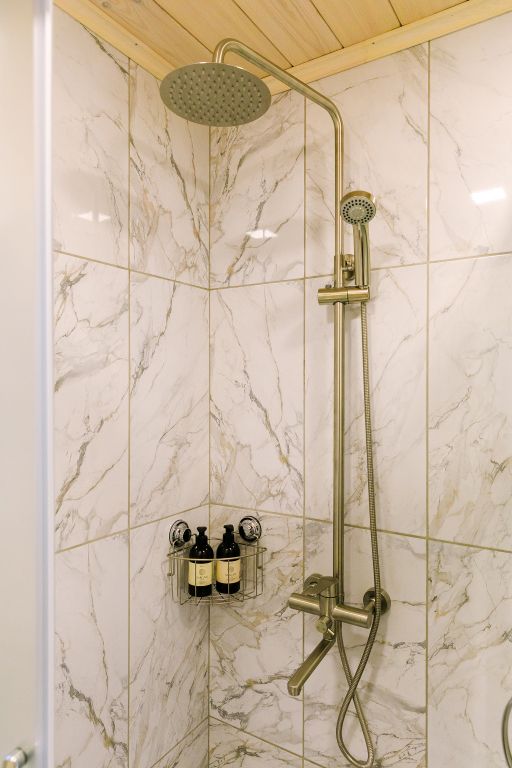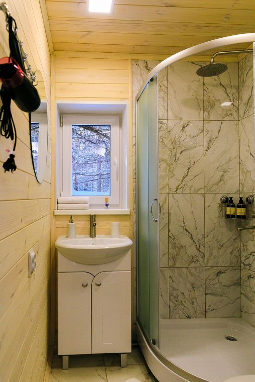 - душевая: есть туалет, раковина, душевая кабина, теплый пол, горячая вода всегда, фен, электрический сушитель, полотенце, косметические принадлежности (шампунь, гель, мыло).