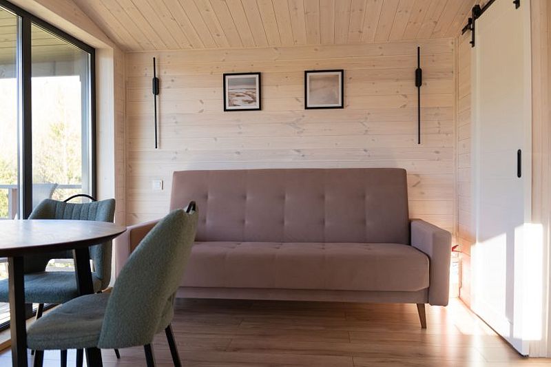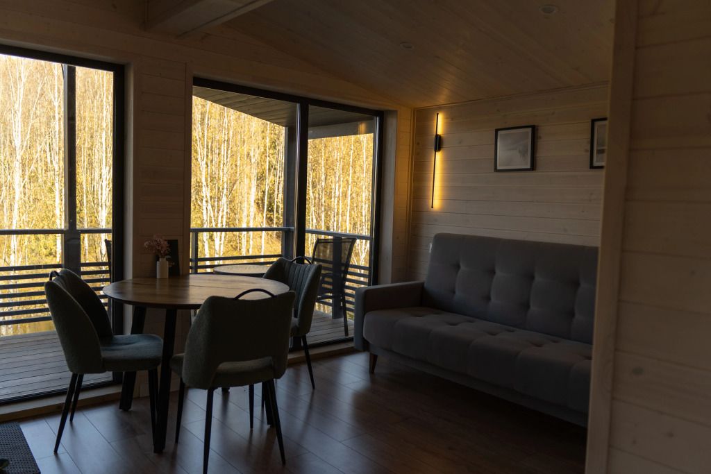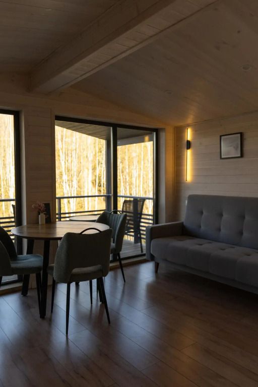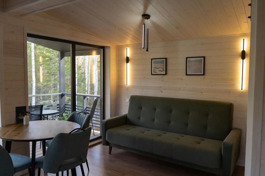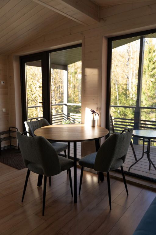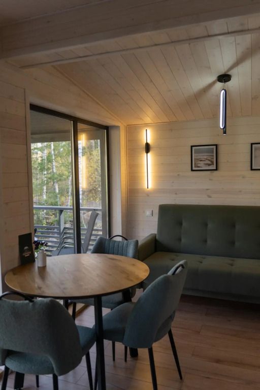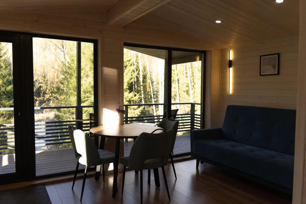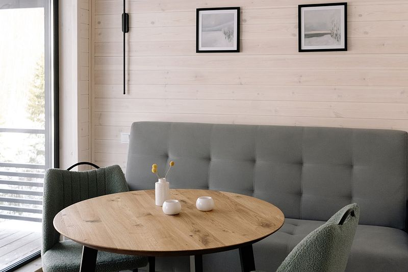 Каждый дом оборудован всем необходимым для комфортного отдыха: полностью оборудованная кухня и уютная обеденная зона с большим круглым столом создают идеальные условия для семейных ужинов. Комфортные теплые полы и конвекторные обогреватели помогут создать расслабляющую атмосферу в любую погоду.