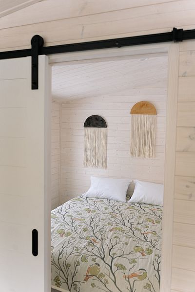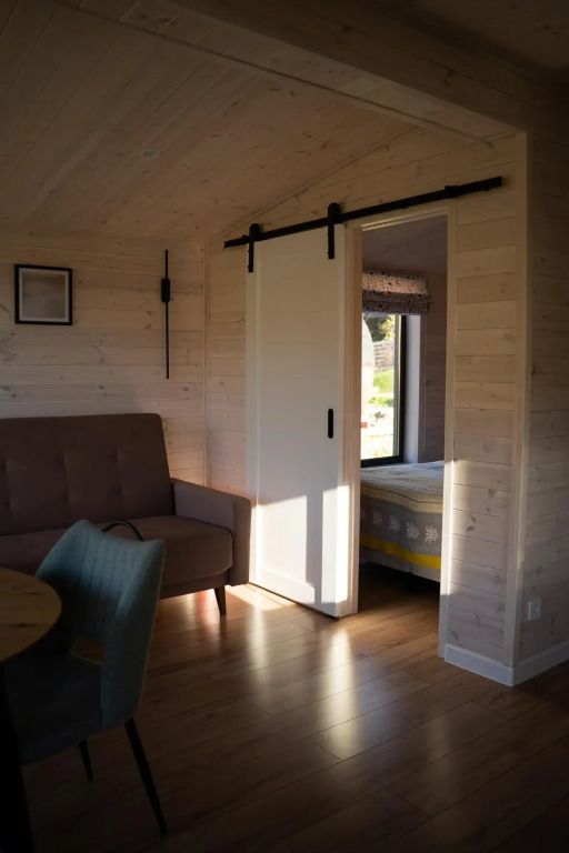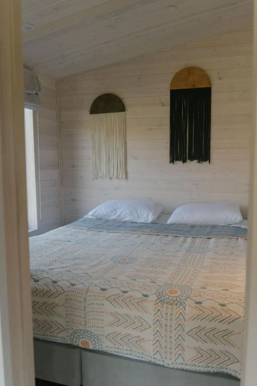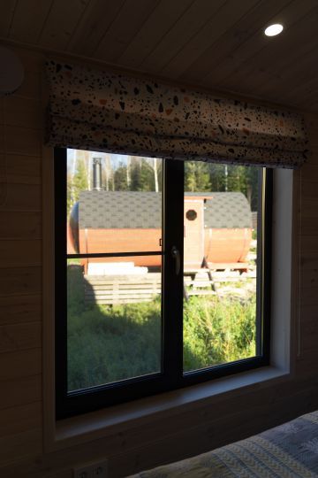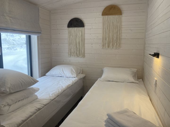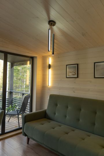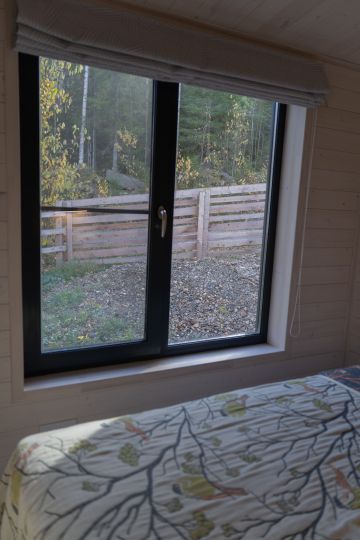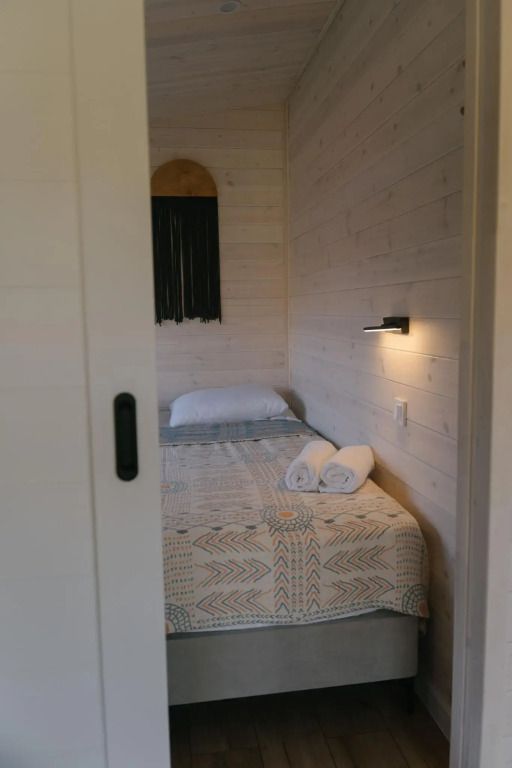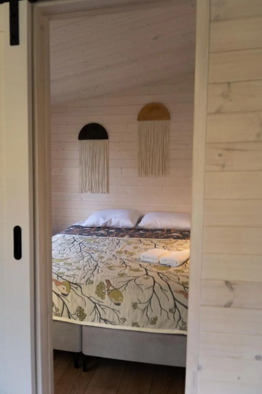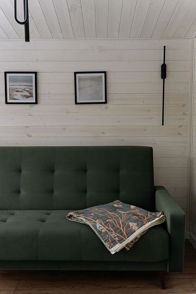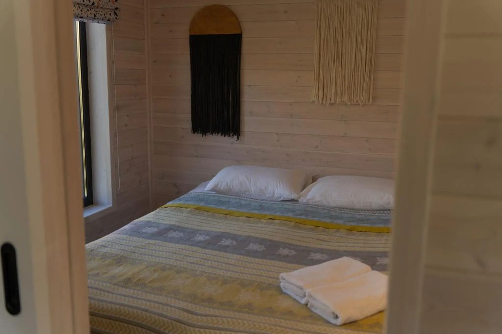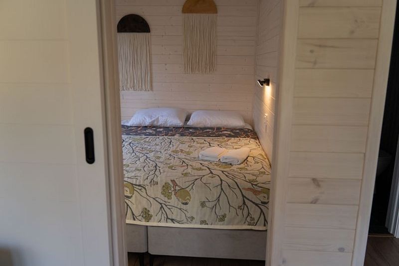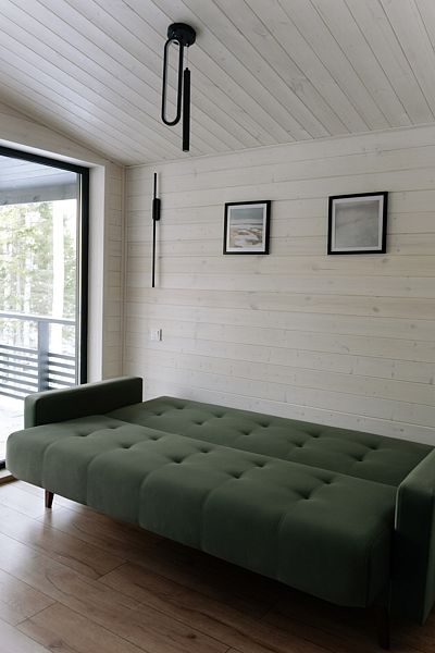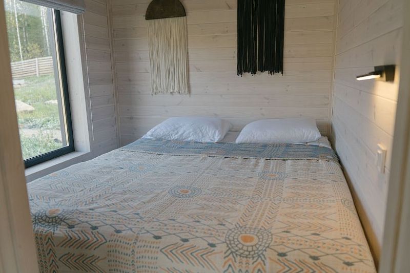 Дом имеет отдельную комнату с двуспальной кроватью (160*200 см), которая при запросе трансформируется в две односпальные (80*200 см). В общей комнате стоит диван, который раскладывается в двуспальное место.