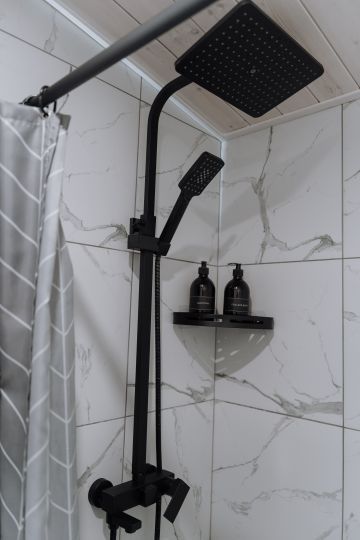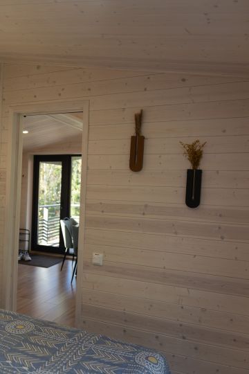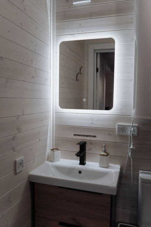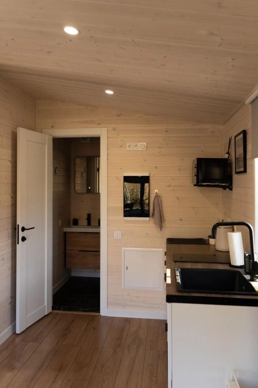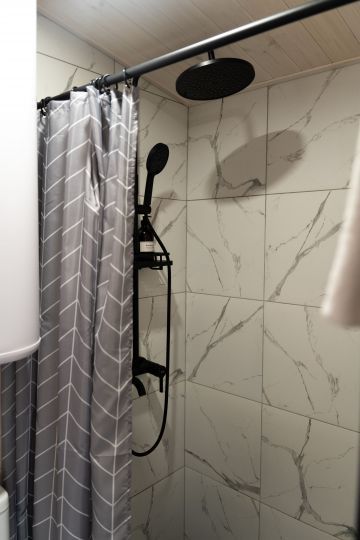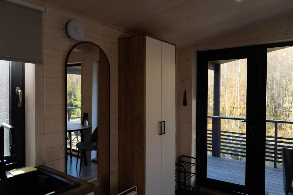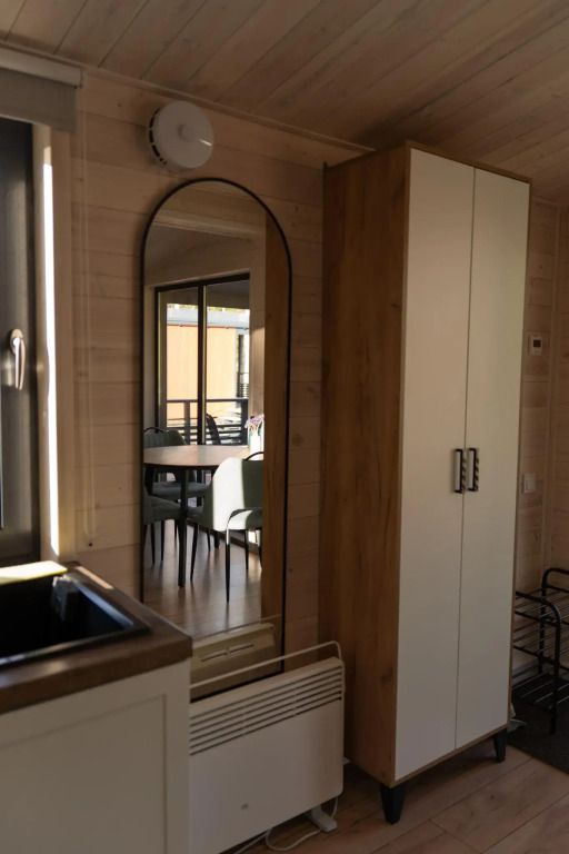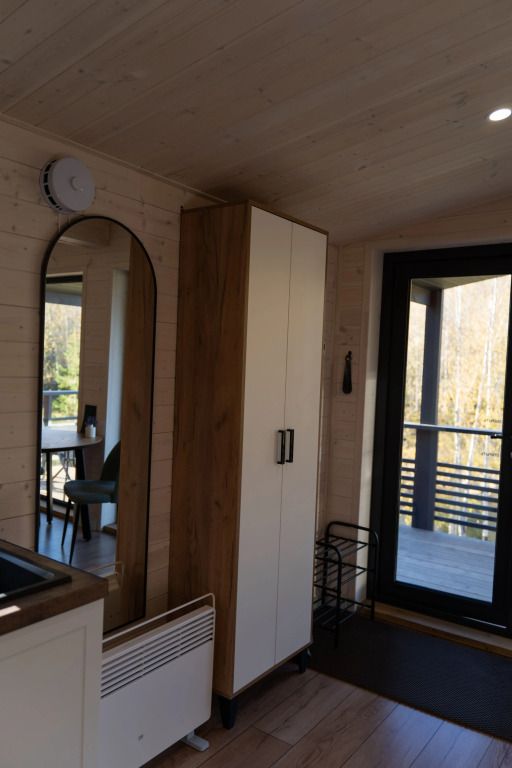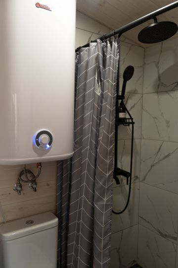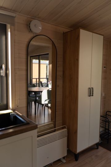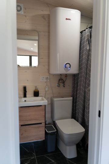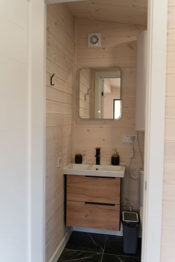 Шкаф для вещей и большое зеркало, плечики и крючки для одежды. В доме есть горячая вода, водонагреватель на 80 л., душ, раковина и унитаз. Электрический полотенцесушитель, косметическое зеркало с подсветкой, фен, шампунь, гель для душа, жидкое мыло для рук.