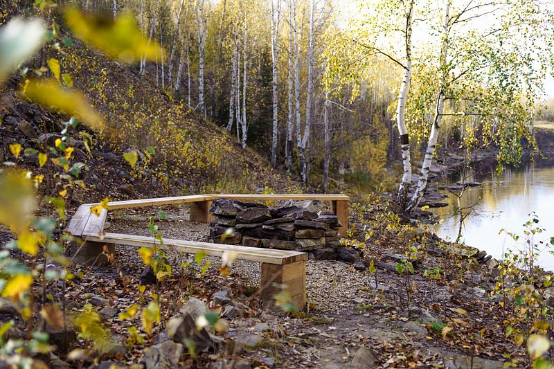 Дома расположились в гористой местности. Ландшафт богат камнями самых разных размеров, которые расположились на территории комплекса. С террасы дома открывается вид на каменистый берег реки Усьва, огромные валуны, покрытые мхом.