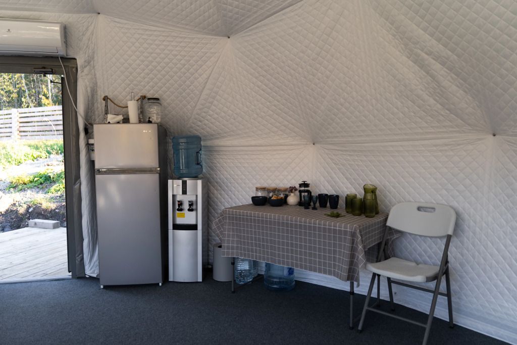 Купол в глэмпинге «Панорамный» — отличное место для проведения семейных торжеств, фуршетов и для отдыха, если бронировать несколько домиков. В то время как купол будет для совместного времяпровождения, домики будут служить уютным уголком для отдыха и уединения.