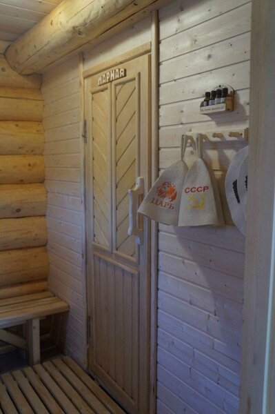 На первом этаже расположен санузел с душевой кабиной, зона отдыха, состоящая из раскладного дивана, двух кресел, журнального столика и телевизора. В домах установлен электрический теплый пол. Есть тумба, в которой находится чайник, чашки, блюдца, чай и кофе в ассортименте и сахар.
