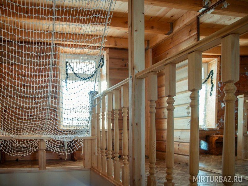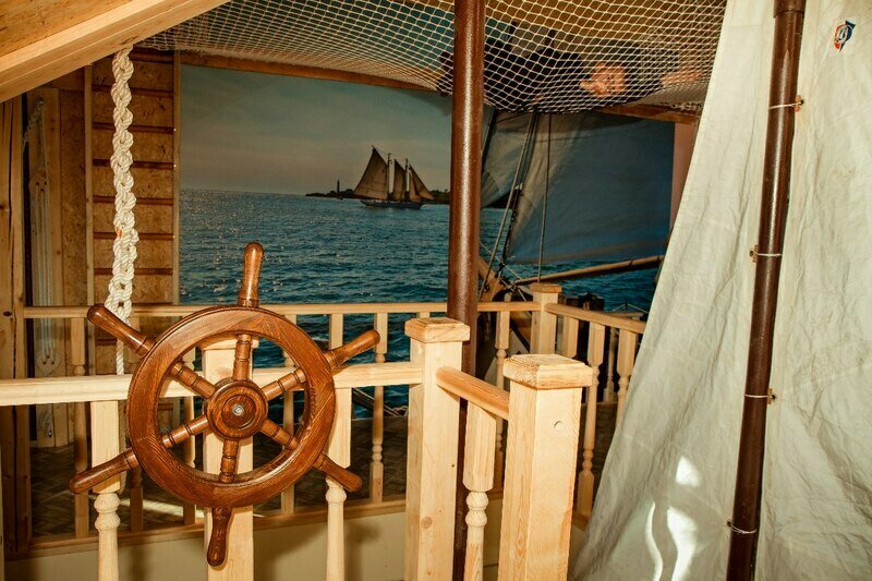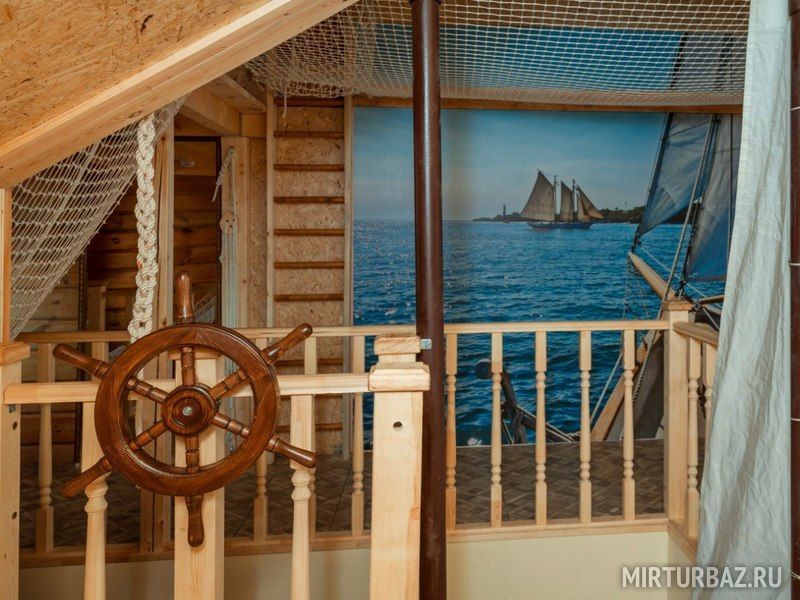 Формат квартиры студии. Тематический интерьер. До 22 спальных мест, кухня, гостиная, два сан-узла. 1 и 2-х спальные места в виде палуб под сводом крыши, раскладные диваны в виде сундуков, гостиная для застолья. Весь третий этаж гостиницы.