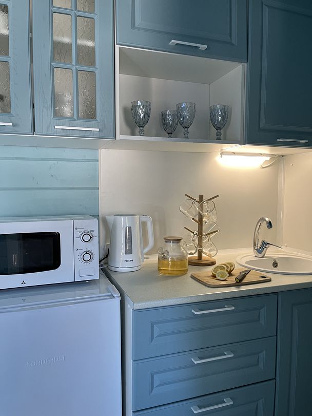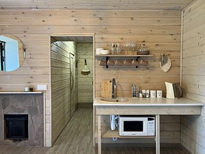 В бане есть просторная комната отдыха с кухонной зоной, столом со стульями и скамейками (чай, посуда, бокалы, кружки, тарелки, столовые приборы, чайник электрический, чайник заварочный, СВЧ).