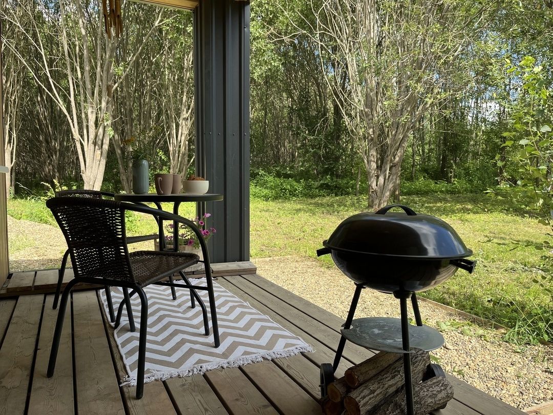 Открытая веранда на улице, мангал, садовая мебель.