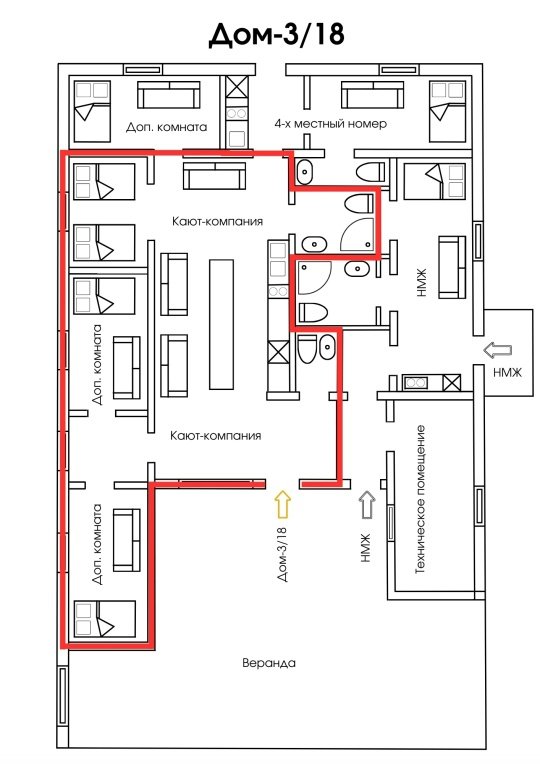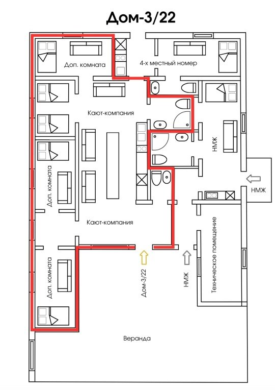 Часть дома №3 для 26 человек (6 двуспальных кроватей и 7 двуспальных дивана).