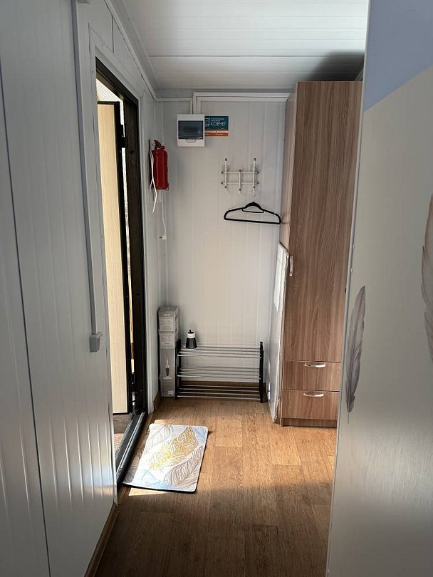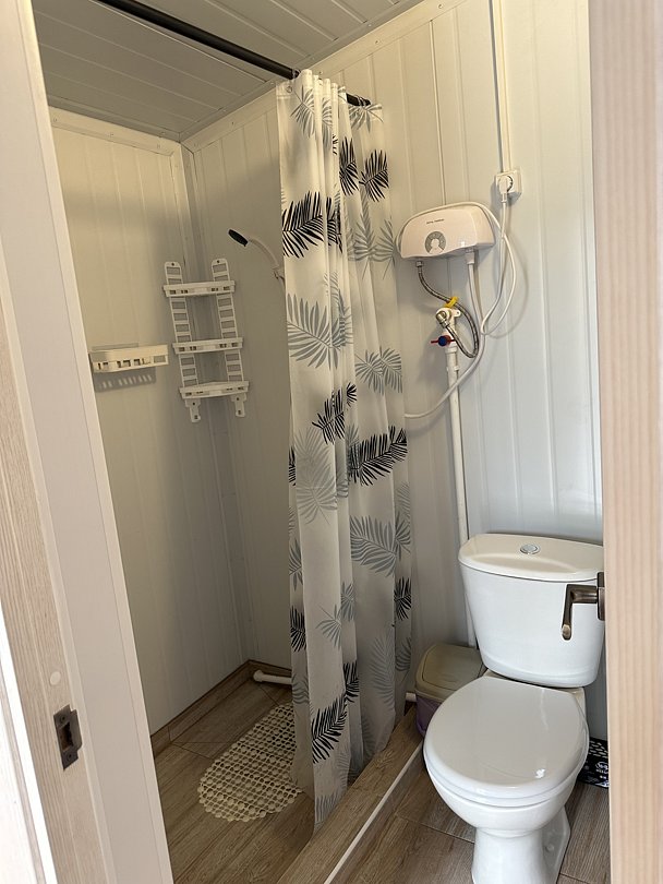 В домиках есть душевые с горячей водой, туалеты, на входе в домик лейки для мытья ног, пылесос, кондиционер, холодильник, телевизор, интернет, телевидение, микроволновка, мультиварка, утюг, фен, чайник, посуда для пляжа пластик, посуда для домика стекло.