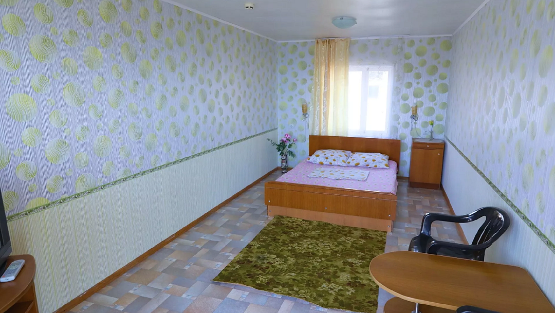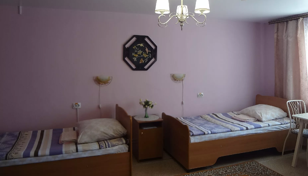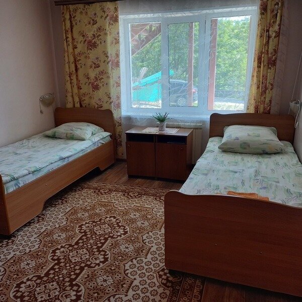 2-х местный номер эконом с двуспальной кроватью: 2-х спальная кровать, телевизор, полотенца для лица, бра, прикроватные тумбочки, кресла, журнальный столик, стеллаж для одежды. Санузел и душевые кабины находятся на этаже, в отдельном помещении.