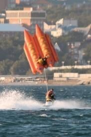 Водный парашют, одна надувная горка на воде, 6-ти местный бот-банан, тюбинги, водные лыжи, водный мотоцикл и прогулочный катер