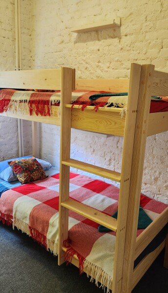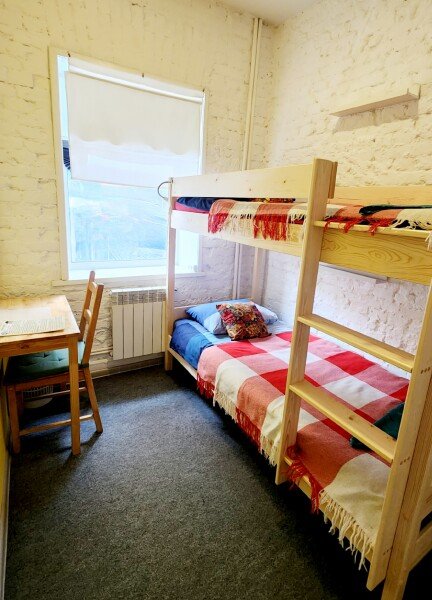 Небольшая двухместная комната с двумя раздельными спальными местами в виде двухъярусной кровати и общими удобствами.
