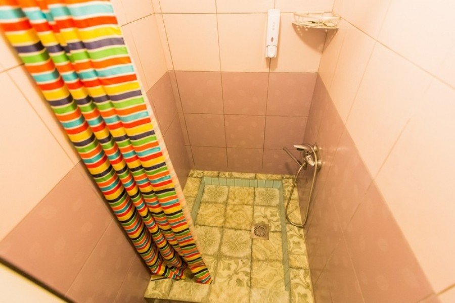 В комнате есть двуспальная кровать, стул, стеллаж, зеркало, вентилятор, светильник и крючки для одежды. Душ и туалет общие на этаже.