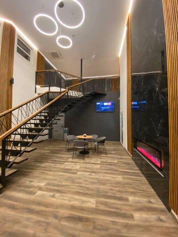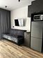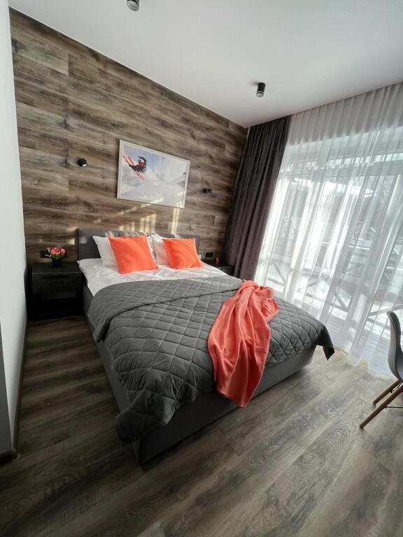 В номере: двуспальная кровать, раскладной полутораспальный диван, шкаф для вещей с зеркалом, письменный стол, 2 стула, телевизор, электрический чайник, микроволновая печь, холодильник и кондиционер.