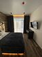 В номере: двуспальная кровать, шкаф для вещей с зеркалом, письменный стол, 2 стула, телевизор, электрический чайник, микроволновая печь, холодильник и кондиционер.