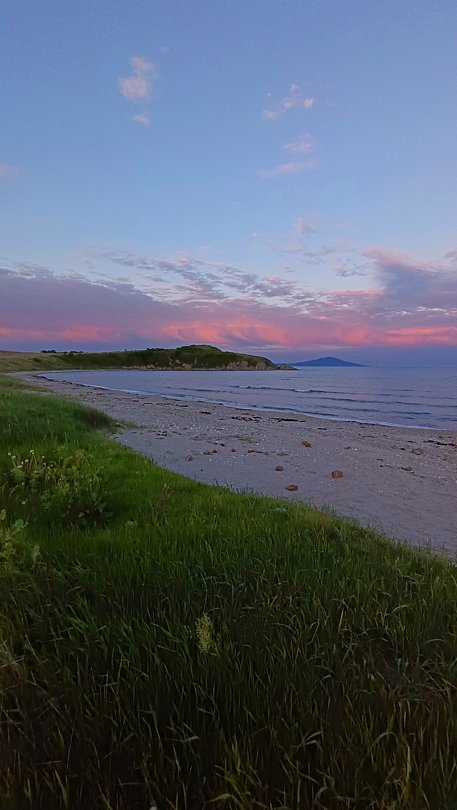 Дорога идет через лесок и далее вдоль бухт Алеут, Лукина до мостика на ее окончании у мыса Молот. Мостик нужно переехать!!! И подняться вдоль линии ЛЭП и длинного забора на мыс — оттуда открывается вид на соседнюю бухту и строения базы.