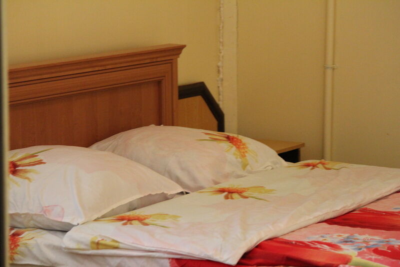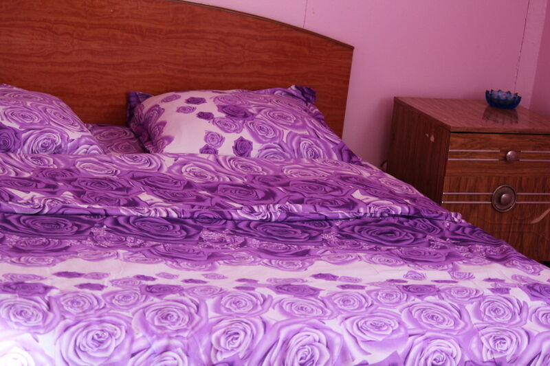 Двуспальная и 1 односпальная кровати, вешалка, тумбочка, постельные принадлежности и постельное белье.