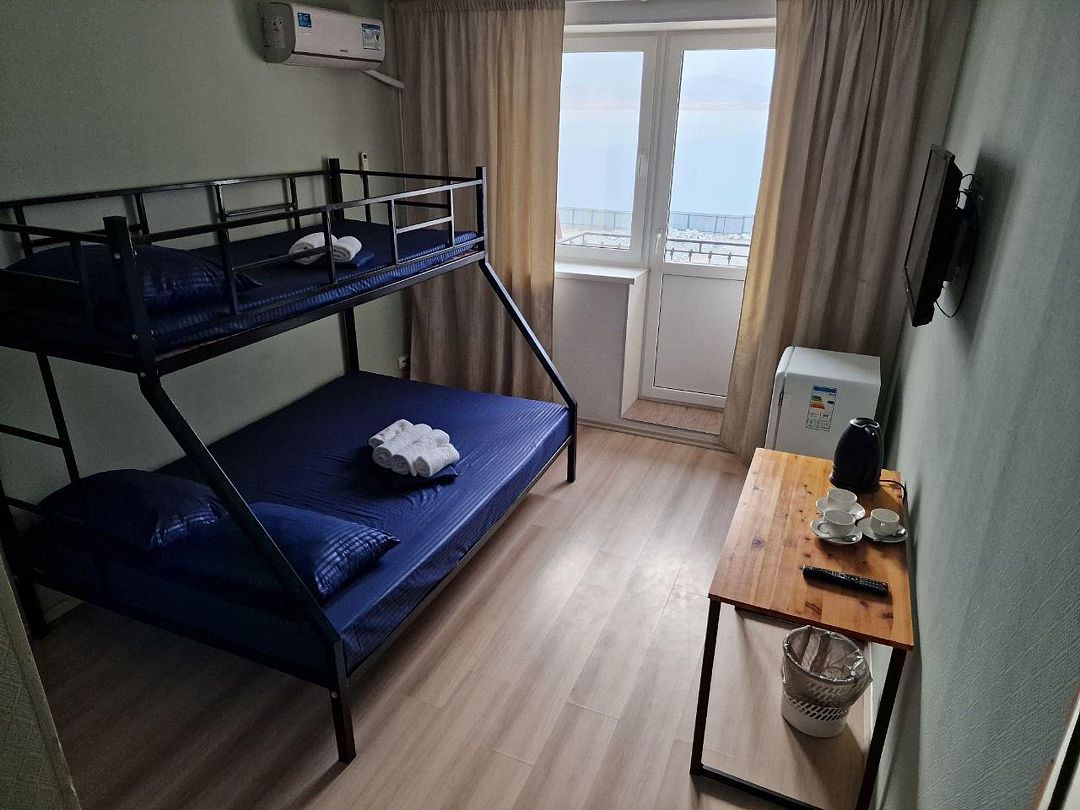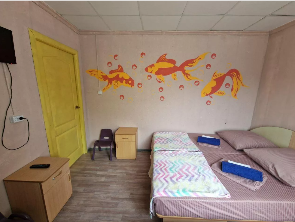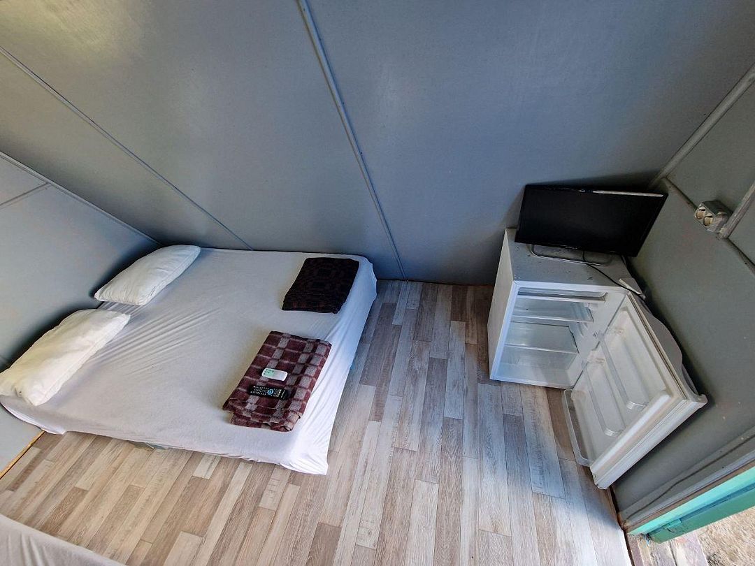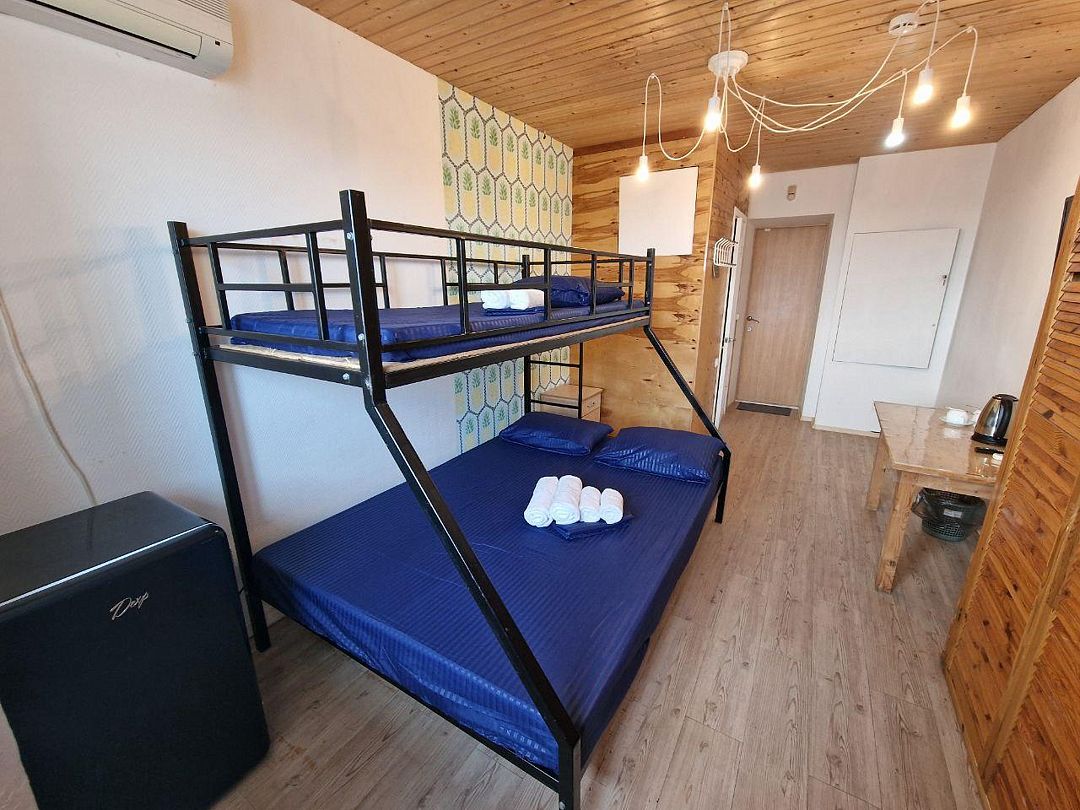 двуспальная кровать, двухъярусная кровать, телевизор, холодильник, шкаф, туалет и душ находятся на этаже номера.