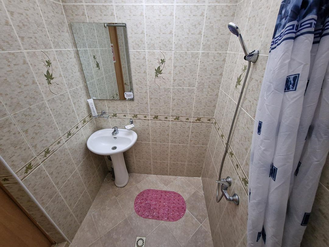 двуспальная кровать и две односпальные кровати, телевизор, холодильник, шкаф, туалет и душ находятся на этаже номера