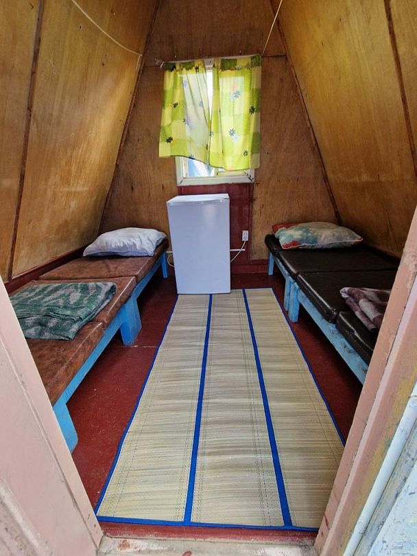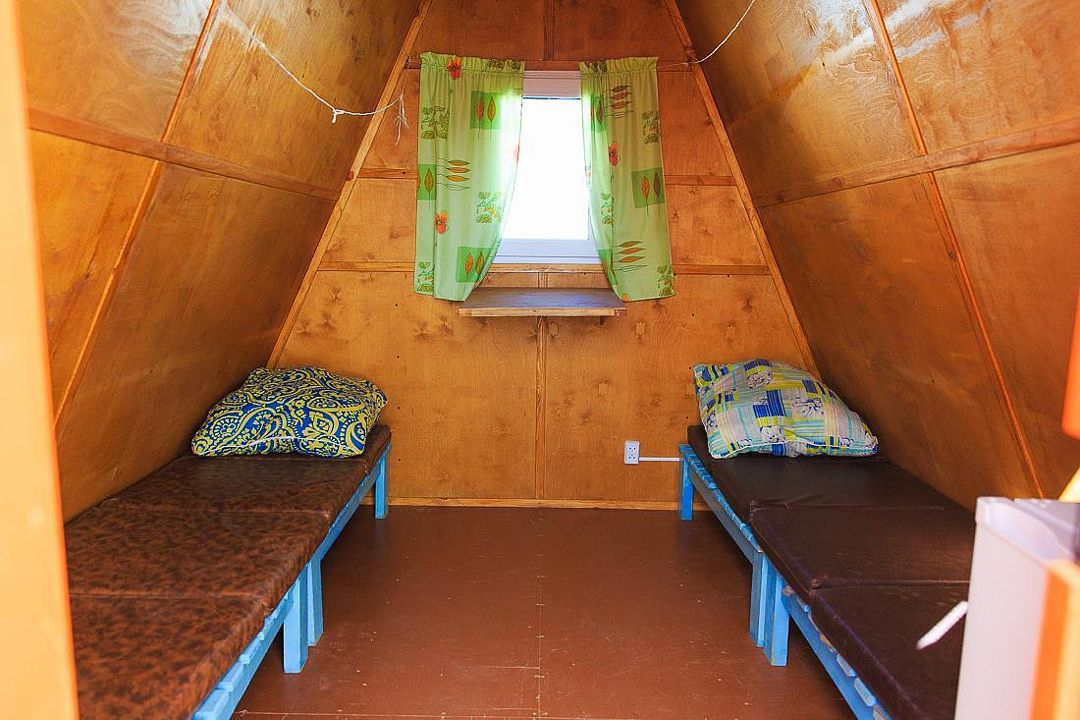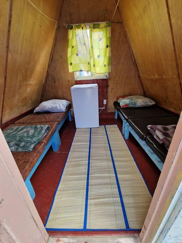 2спальн. и 1спальн. кровати, стационарное электропитание, телевизор, холодильник, тент на улице, деревянный столик и скамейка. Постельное белье, полотенца, баллон с газом для плитки не выдаются.