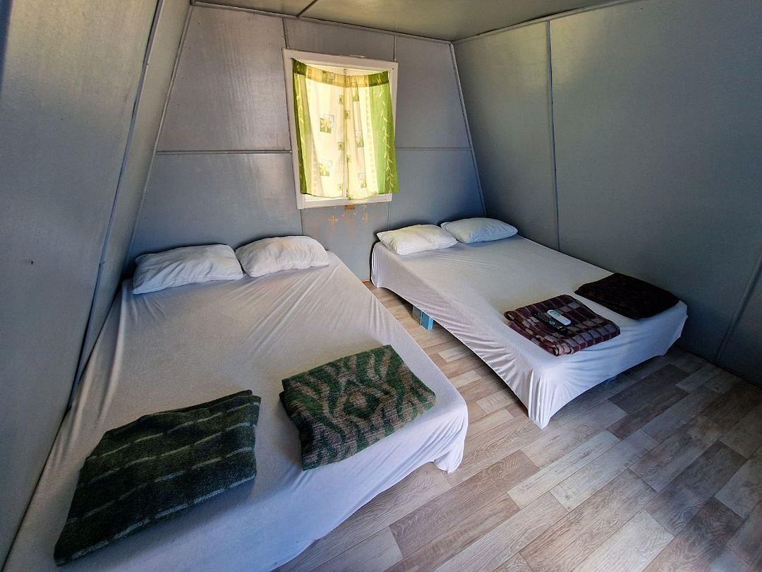 комплекс из 2х кемпингов объединен общей верандочкой и столом. в первом: двуспальн. кровать, Х. Во втором: две 1спальн. кровати, Х