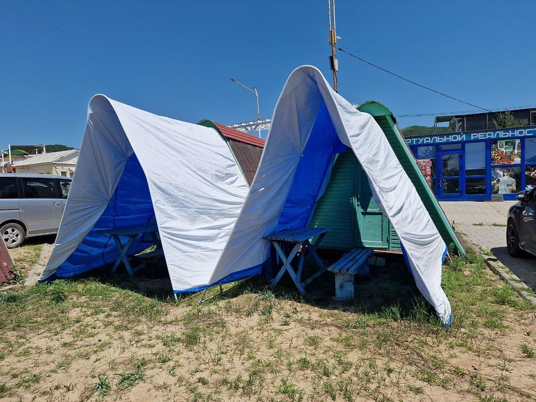 Для гостей, которые приезжают в 2 соседних домика на базу отдыха есть услуга натяжения общего тента. Самостоятельное вмешательство в конструкцию домика запрещено.
