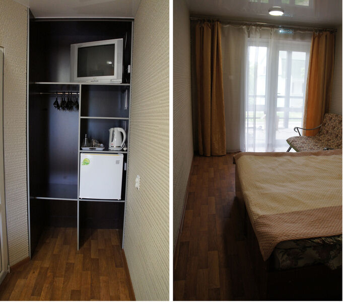 Комплектация номера: Кровать двуспальная, диван( раскладной на 2 человека) тумбочки, шкаф для одежды, телевизор, холодильник, чайник.