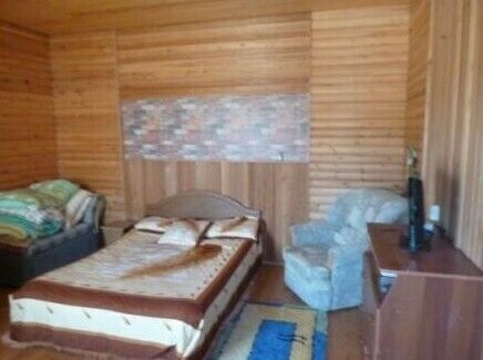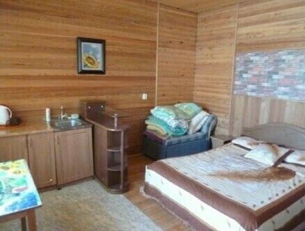 В домике 2х спальная кровать, софа, кресло, камод, кухонный гарнитур с мойкой (раковиной), чайник, обеденный стол.