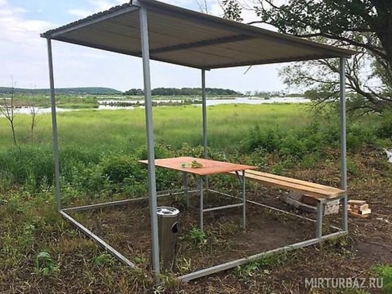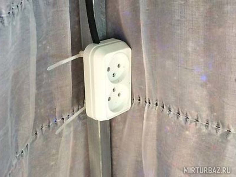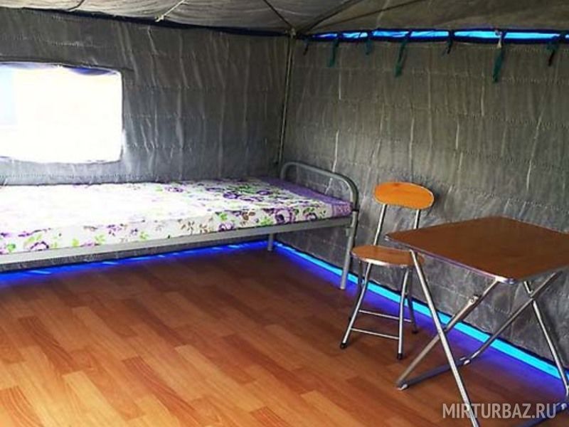 В домике два окна с сетками, освещение, розетка, на полу линолеум, две кровати 2000х900, матрацы, подушки, столик, вентилятор, два стула. Возле домика установлен стол, на котором можно готовить еду. Размер домиков 3000х4000, высота потолка 2300 мм.