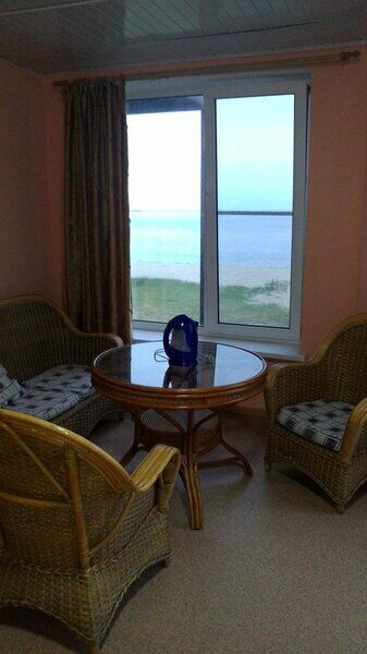 Номер расположен на первом этаже корпуса, красивый вид из окна на море, южная сторона, две комнаты общей площадью 32кв.м. номер с удобствами (душ, гор., хол. вода, (вода из скважины, немного подсоленная) туалет) кондиционер, телевизор, установлено спутниковое телевидение, плетеная ротанговая мебель(диван, два кресла, журнальный столик) 2х спальная кровать, угловой 2х спальный диван, шифоньер.
