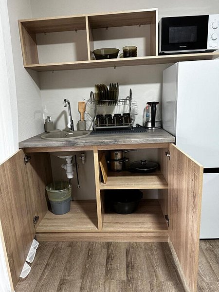 Отель предлагает 4-х местный номер. Номера находятся на 2 этаже, где есть балкон. В самом номере находится: двуспальная кровать, двуспальный диван, стол и стулья 3 шт., холодильник, чайник, кондиционер, тёплый пол, телевизор, микроволновая печь, сейф, фен, сушка для белья, шкаф для хранения личных вещей, мини-кухня с раковиной, посудой и кухонными принадлежности. В санузле есть раковина, туалет и душ. Предоставляются полотенца и постельное бельё.