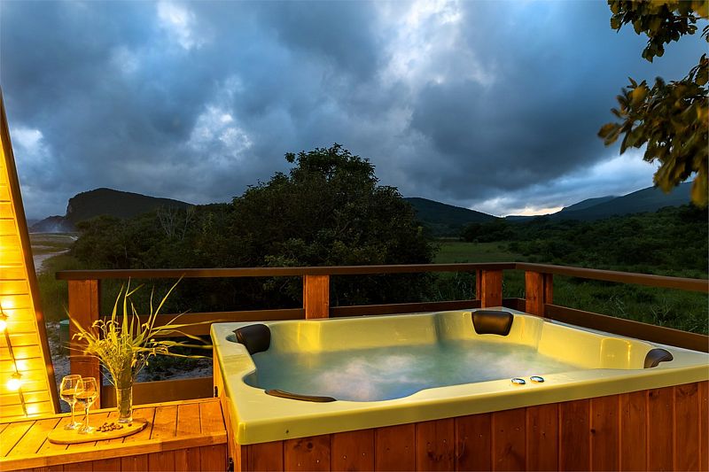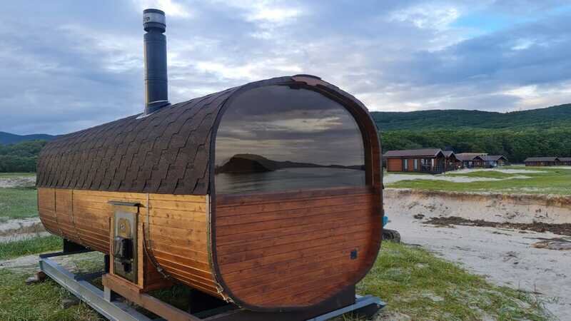 Баня расположена на пляже, всего в 10 метрах от кромки воды. Горячая купель с видом на море подарит множество сладостных минут, особенно приятно в ней любоваться закатом. После горячей парной можно окунуться в прохладном море.