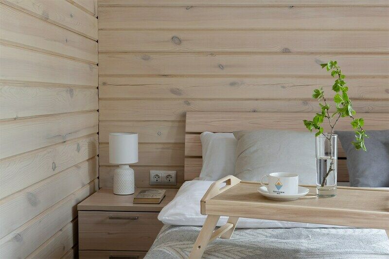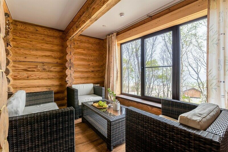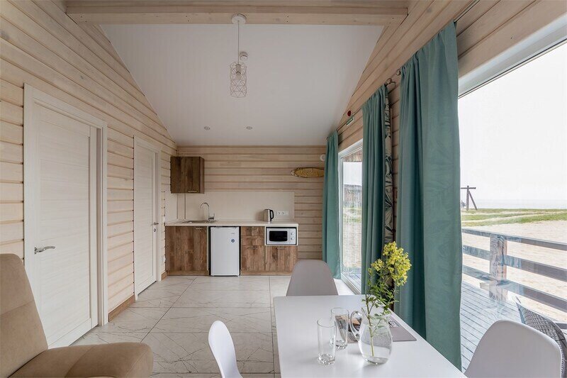 Уютный дом с террасой на берегу моря. Панорамные окна открывают потрясающий вид на бухту. Дома из натурального дерева хвойной породы, интерьер выполнен в светлых тонах, что создает простор и легкость.