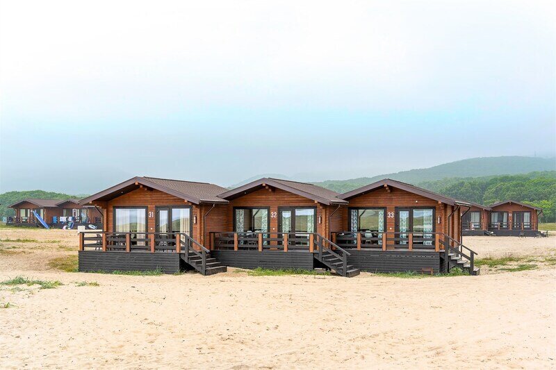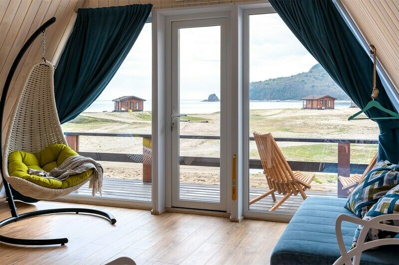 Семейный отдыхДостоинстваПровели здесь два замечательных дня, которые точно запомнятся нам надолго. Погода нам благоволила. Очень приятно было смотреть на море, нежась на солнышке. Сотрудники очень быстро выдали нам ключи от двухместного домика. Внутри даже камин есть. Очень уютно. Отдельно находится кухня, есть все возможности для готовки, правда продуктов нет. Кто не хочет готовить - для тех бюджетное кафе с большим выбором блюд. Но больше всего восторгов вызвала баня