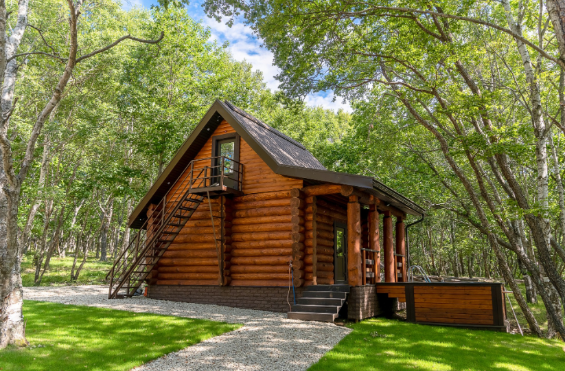 Русская баня с панорамным окном в лесу