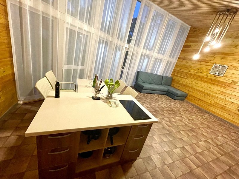 В двух спальнях и в гостиной с раскладывающимся диваном размещается до 4 взрослых и 2 детей до 14 лет. На кухонном острове есть всё необходимое для готовки: посуда, столовые принадлежности и современная техника, в том числе посудомойка и капсульная кофеварка. Инверторные кондиционеры работают как на холод, так и на тепло.