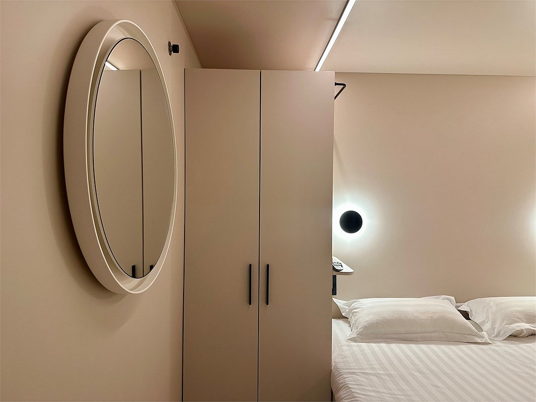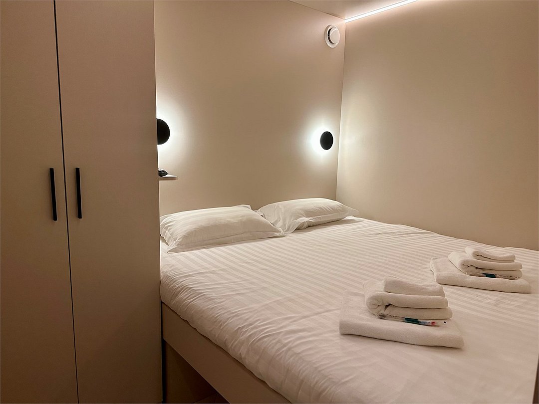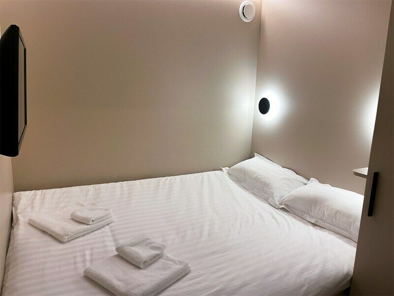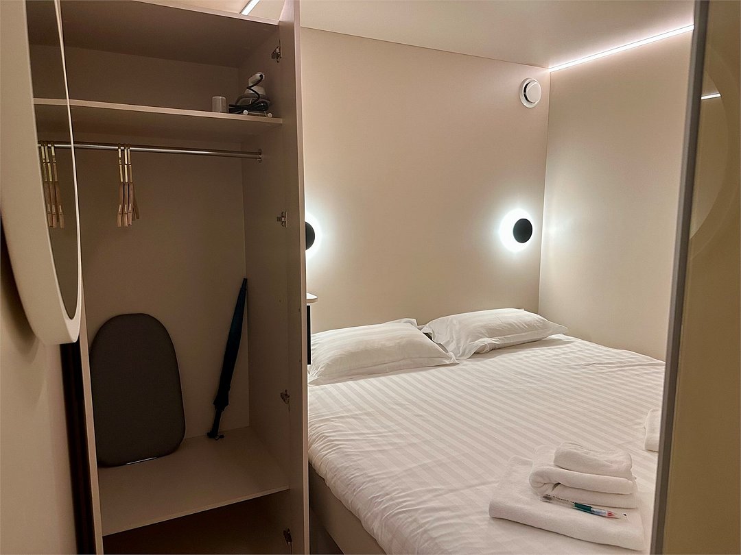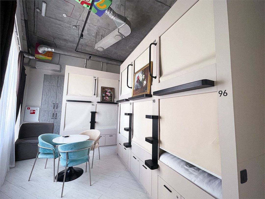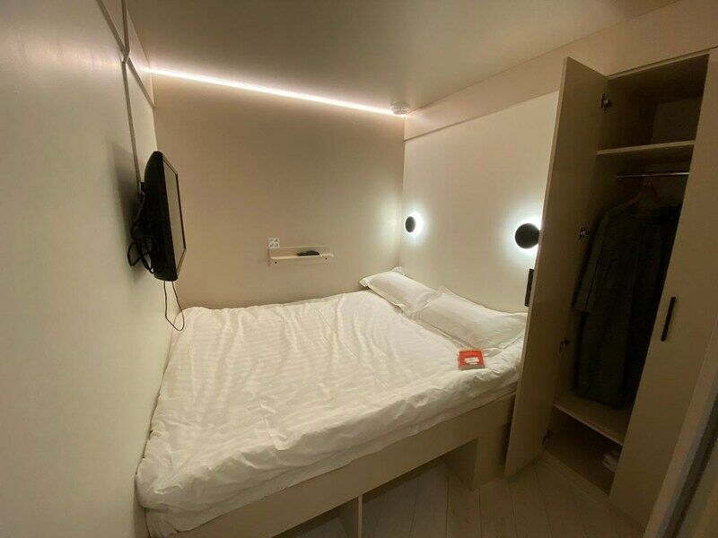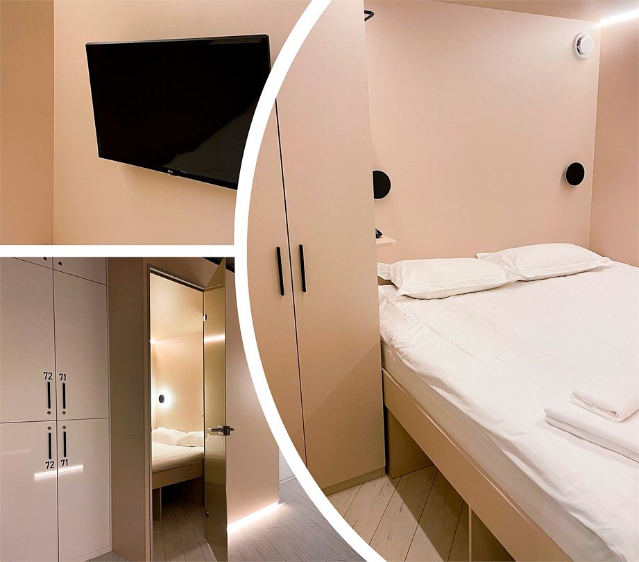 Двуспальная капсула 4 кв.м на верхнем ярусе в общей зоне — это комфортное приватное пространство для двоих в формате капсульного отеля, где проживают мужчины и женщины. Внутри есть зеркало, вытяжка, полочка для личных вещей, вешалка-перекладина и крючок, а также две отдельные ячейки для обуви и два запирающихся шкафа для хранения. Гостям выдаются два комплекта полотенец (банное и среднее), тапочки с возможностью замены и гигиенические принадлежности по запросу, а удобный санузел расположен прямо в пределах зоны.Услуги и удобства