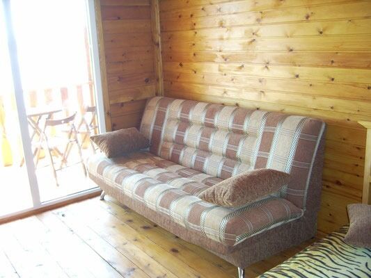 Комната, 12 кв. м, в которой расположены: раскладной двуспальный диван, двуспальная кровать, холодильник, телевизор (3 канала), термос, место для размещения одежды (крючки), комод, зеркало, стол и 2 стула; санузел – туалет, душевая кабина (горячая вода-бойлер), умывальник, зеркало, полотенцедержатель, этажерка для размещения вещей. Из витражного окна открывается вид на море. Жалюзи. Розетки в номерах. Веранда, 12 кв. м, на 2 комнаты: набор уличной мебели (стол и 2 стула).