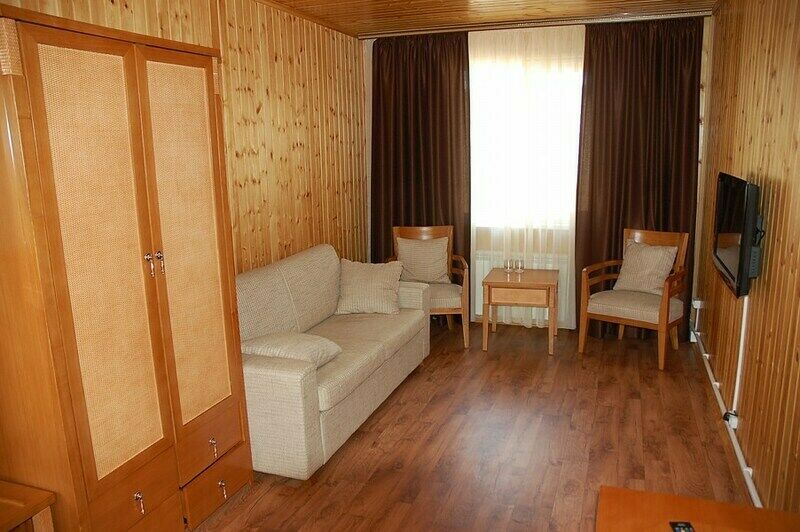 В номере: кровать (двуспальная или две односпальные), холодильник, шкафы, стол, два табурета, зеркало, санузел (ванна, унитаз, умывальник). При желании возможно предоставление дополнительного места для ребёнка.