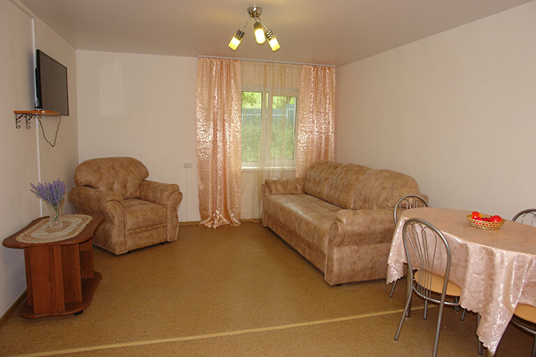 Коттедж имеет общую гостиную на первом этаже, в которой расположен раздвижной диван, рассчитанный на два спальных места, плазменный телевизор со спутниковой антенной. Кухню с оборудованием, для приготовления пищи. На втором этаже: спальня в которой располагается одна двуспальная кровать, тумба для одежды, кондиционер, постельное белье. Санузел. Душ.