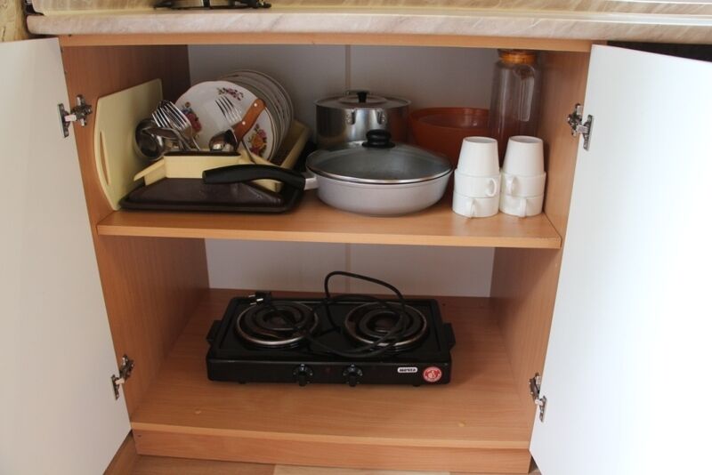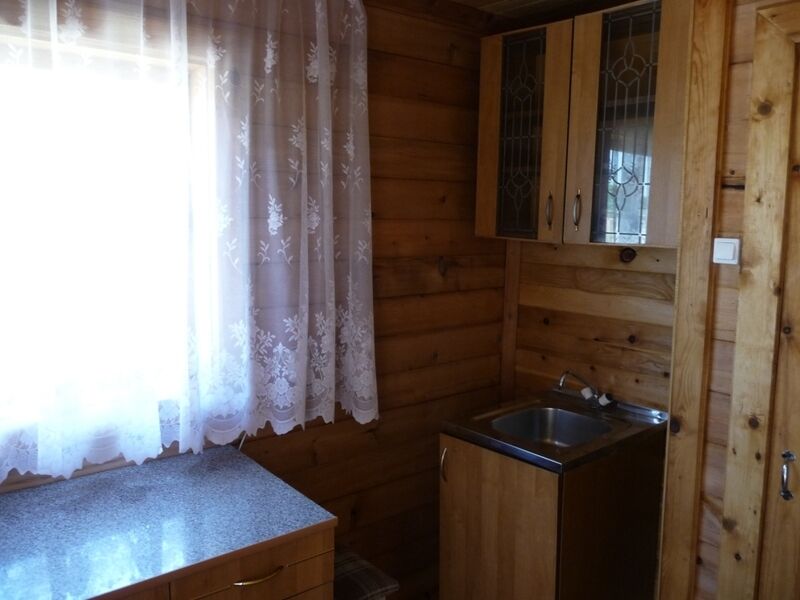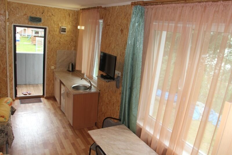 - Кухня в домиках оборудована холодильником, электропечью, чайником, мойкой, разделочным столом, необходимым набором посуды.