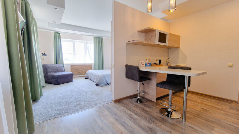 1) В комнатах хороший ремонт, новая мебель, ТV. Есть кухня со всем необходимым, кроме плиты (холодильник, СВЧ-печь, посуда)