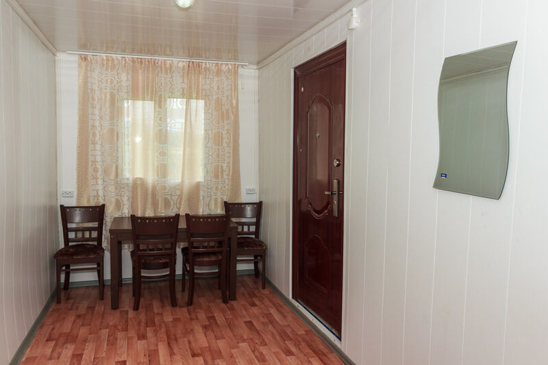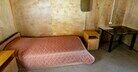3 односпальные кровати, или 1 односпальная кровать и 2-х спальная, стол, стулья, электричество. Открытая веранда. Предоставляется постельн. белье. С/у рядом с домиком на улице: Душ (платный), умывальники и туалеты размещены в отдельном санитарном блоке.