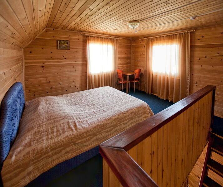 На первом этаже двухместный диван. На втором этаже две полутороспальные кровати, стол стулья, постельные принадлежности.