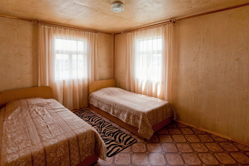 В каждом домике 2 односпальные кровати или двуспальная кровать, стол, стулья. Санузел на улице.