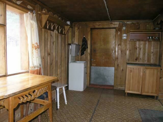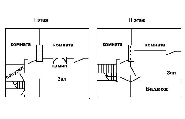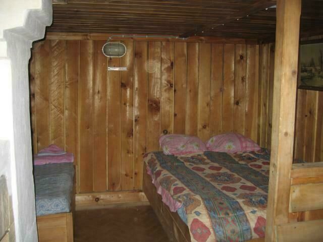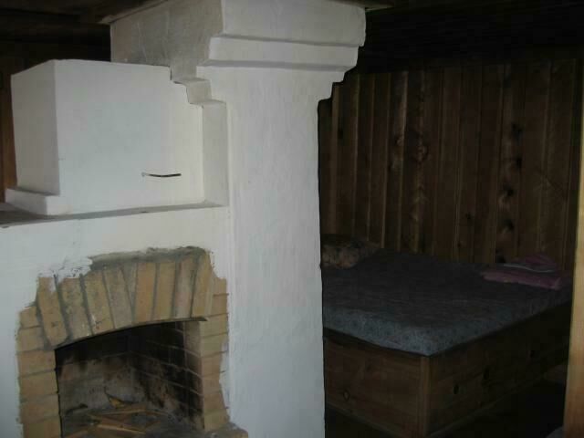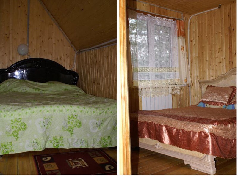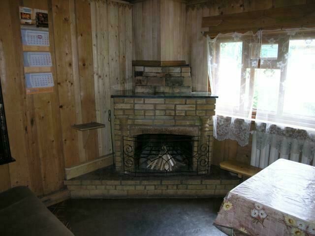 Первый этаж - две комнаты: зал-кухня (камин, печь, холодильник, раскладной диван на 2 чел) и вторая комната с двуспальной кроватью. Второй этаж: один номер на 4 человека (двуспальная кровать, диван раскладной на 2 человека), второй номер на 2 человека (двуспальная кровать). туалет один на дом, на первом этаже. Отопление печное.