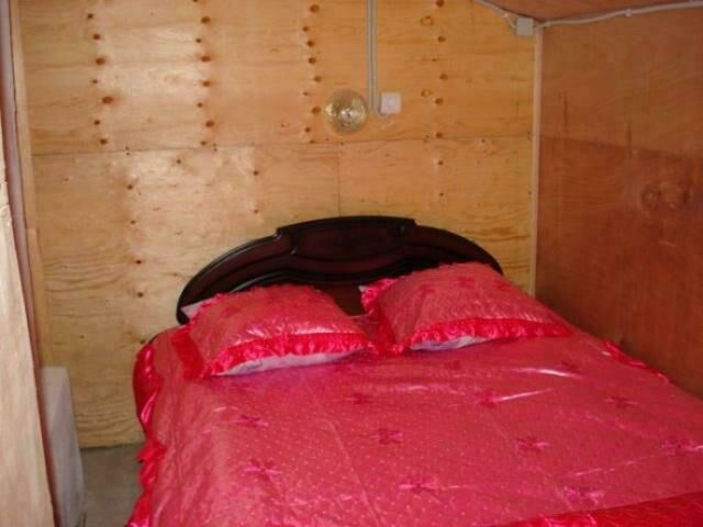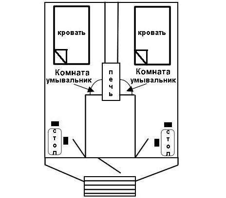 Две комнаты, в каждой двуспальная кровать, стол, табуретки, умывальник. Между комнатами печь. Отопление с прихожей, самостоятельно или кочегаром. Туалет на территории базы.