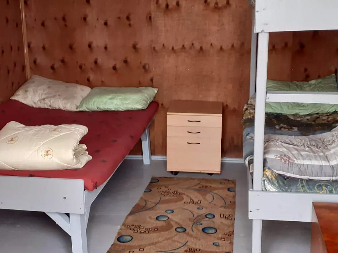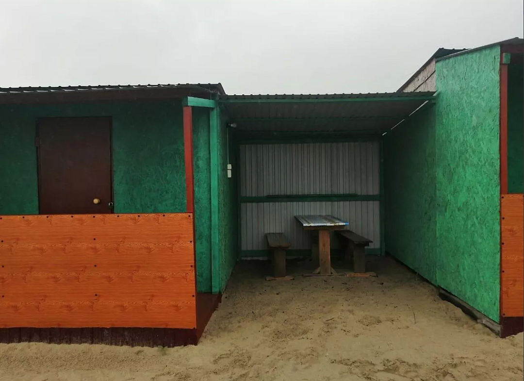 В каждом домике есть двуспальная и односпальная кровати, зеркало, столик, вешалка для одежды, постельное белье, посуда (стаканы, тарелки, ложки, вилки, нож, кастрюля, сковорода), газовая плита (баллоны можно привезти с собой или приобрести в магазине на базе), и холодильник. Также рядом с каждым домом есть летняя кухня для приготовления пищи (стол, лавочки, полочки).