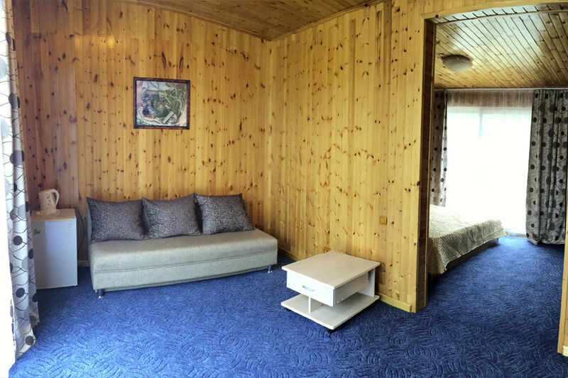Имеют отдельную парковку для автомобилей, домик состоит из двух комнат, первая комната - гостиная - набор мягкой мебели (двуспальный раскладной диван, кресла), столик, телевизор. Вторая комната – спальня, оборудованная одной двуспальной или двумя односпальными кроватями.